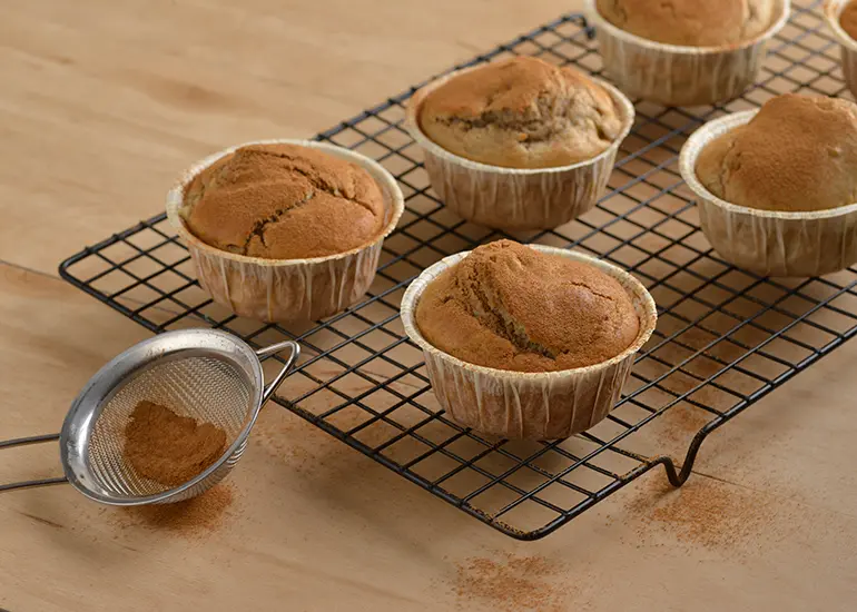 - Em uma tigela, misture a Canela em Pó <strong>KITANO</strong> e o açúcar e polvilhe sobre os muffins. Sirva morno ou frio.