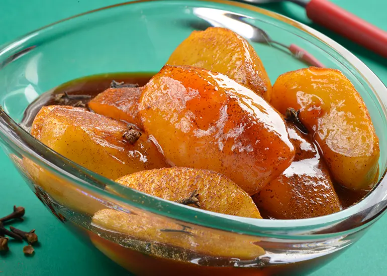 - Acrescente a manteiga ao caramelo e mexa bem para não empelotar. Depois, junte as maçãs, abaixe o fogo e cozinhe por 10 minutos, ou até ficarem macias, virando o lado cuidadosamente na metade do tempo. Sirva quente ou fria.