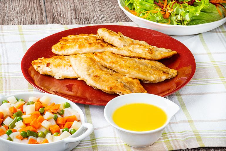 - Tempere os filés de frango com sal e pimenta do reino a gosto.